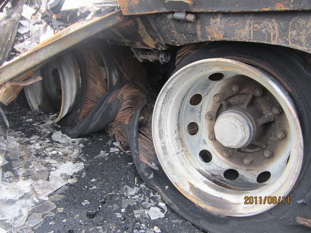 (3)轮胎在运行中爆裂或泄气,一方面使轮胎与轮毂、轮胎与地面摩擦产生高温;另一方面,只要两轮胎中有一个跑气就会发生这种现象,由于相邻的车轮承受了两倍载荷而形成过载,因此导致轮胎摩擦过热。